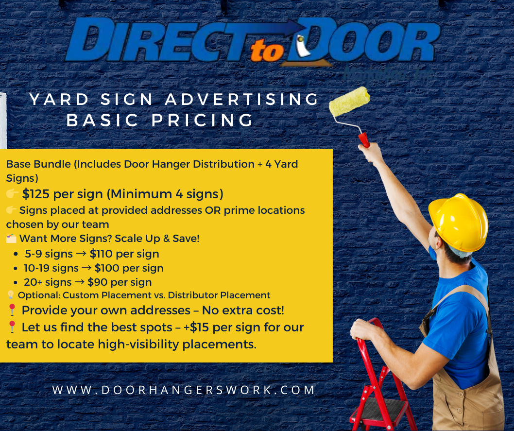 No, yard signs are an optional add-on to any door hanger distribution campaign. However, they significantly increase visibility and response rates.